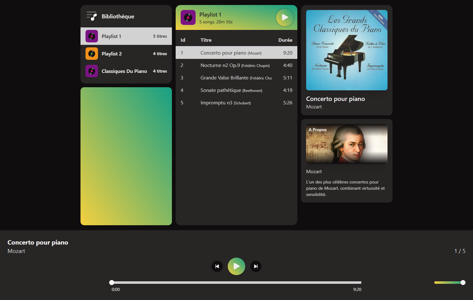 Développement d’un lecteur audio web complet avec React. Interface moderne, gestion des pistes via un fichier JSON simulant une API, et toutes les fonctionnalités essentielles d’un player audio.
